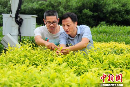 福建省农业科学院茶叶首席余文权(右)博士在国家彩色茶树试验园工作 黄献光 摄