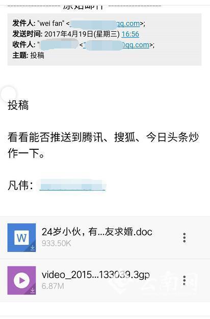 而这个叫凡伟 的人还给云南网投过一篇稿件,记者查证,凡伟于2017年4月19日给云南网投了一篇稿件及视频,稿件标题叫《24岁小伙,有望站在诺奖领奖台向女友求婚》。他在投稿附言中留言称:“看看能否推送到腾讯、搜狐、今日头条炒作一下。”