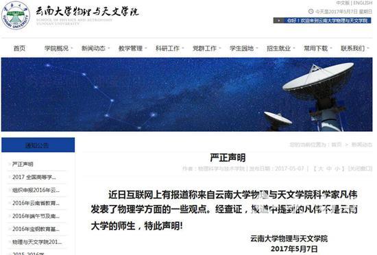 而记者也于5月7日获得了云南大学的回复,声明称:云南大学物理与天文学院科学家凡伟发表了物理学方面的一些观点,经查证,报道中提到的凡伟不是云南大学生师生。