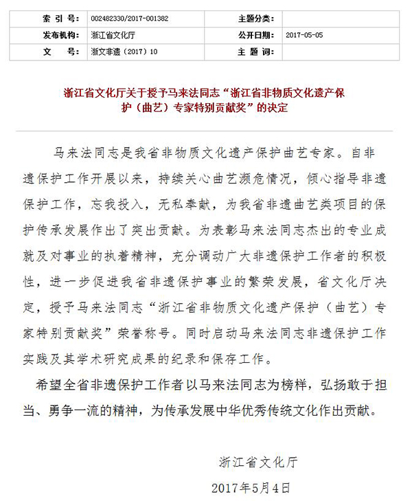 浙江省政府网站信息显示,该省文化厅日前授予马来法“浙江省非物质文化遗产保护(曲艺)专家特别贡献奖”。