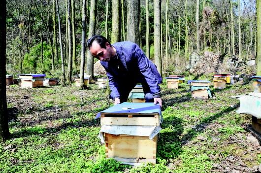 马场镇松林村松林蜜语专业合作社养蜂人韩建波管理蜂场。