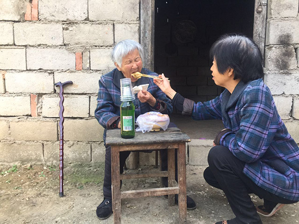 儿孙们回家团聚也不例外,家里人一起在楼里吃,端一碗送到小屋里。中午儿媳送午饭来,顺便收走早饭的碗。