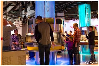 宽敞的展厅内,依据五大洲设立了不同的柱子,每根柱子下面都有该大洲不同国家的可乐口味供人选择。