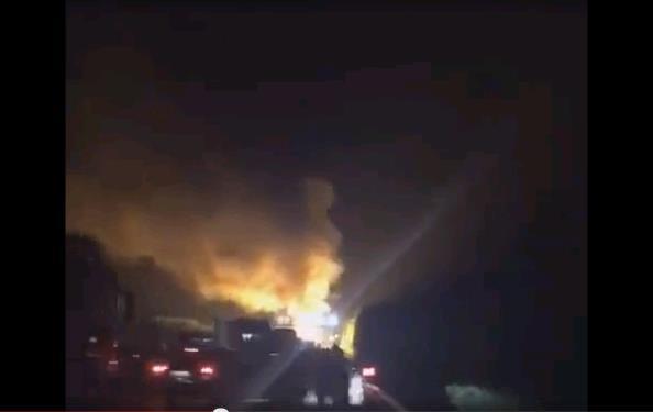 央视记者在看到现场有多量消防车,高速附近的防护林严重受损,估计是事发爆炸的冲击造成,很多树枝倒伏在地上。