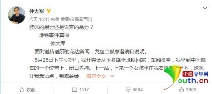 对于女子提出的被蹭胳膊和胸部。仲大军回应称,“ 5月25日下午4点半,我开完会从玉泉路坐地铁回家,车厢很空,我坐到中间偏右的一个位置上,闭目养神。下一站,上来一个女孩坐在我右侧,刚坐下,她就让我靠边点,别蹭着她。我感到这很不礼貌,我坐得好好的怎么能蹭着她,这么宽的地方还坐不开你吗?我一个瘦老头,正正好好坐在自已位子上,又没占你位子的空间,谁也挤不着谁,为何让我挪地方?我就没有动,并告诉她要懂礼貌,没有长辈给晚辈让位的道理”。