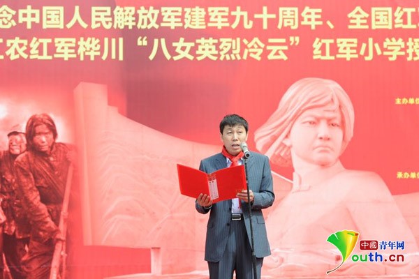 在“八女英烈冷云”红军小学授旗捐赠仪式上,中共桦川县委书记郭广福代表全县人民对红军小学的成立表示热烈祝贺。熊伟 摄