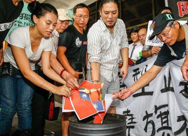 陈妙婷(左1)焚烧“青天白日满地红”旗