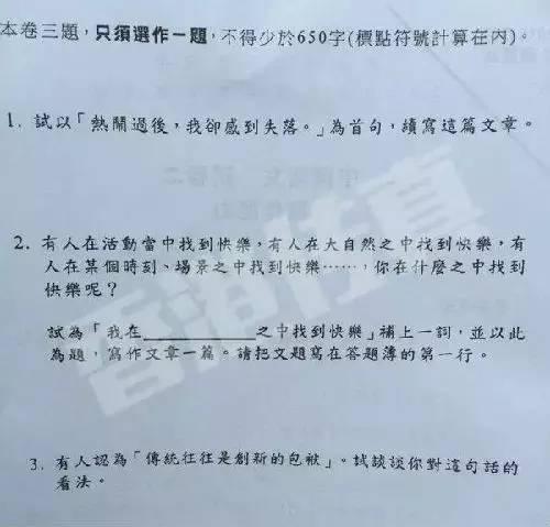 相比于香港“高考”,台湾地区的不少考题中,“励志”意味相当浓:“自胜者强”、“我可以终身奉行的一个字”、“逆境”、“惑”……让人颇有种“头悬梁,锥刺股”的冲动。
