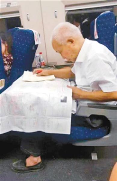 6月12日,在回北京的高铁二等座上,为了做好一场报告,78岁高龄的刘先林院士仍然笔耕不辍。这张照片经人民日报官方微博发布后迅速引发网友的点赞和致敬。