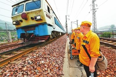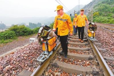 6月14日7时,郑州铁路局月山工务段检查监控车间探伤第6班的队员们走上铁路,开始了新一天的钢轨探伤作业。探伤队员一边推着43公斤重的探伤仪,一边观察显示器上的波形,仔细听取来自仪器上发出的不同提示音,发现异常,确定位置,做好标记,反馈给相关部门,针对情况及时更换或者修复。日复一日,年复一年,探伤工就是这样在平凡的岗位上默默奉献,保障过往列车的安全运行。⑨6