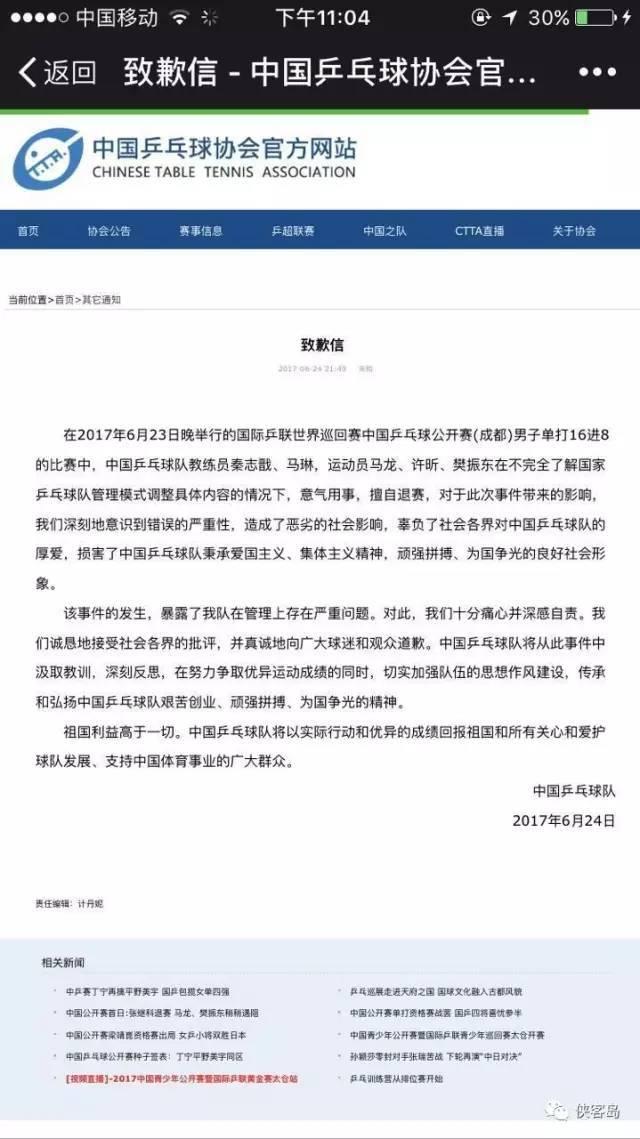 在2017年6月23日晚举行的国际乒联世界巡回赛中国乒乓球公开赛(成都)男子单打16进8的比赛中,中国乒乓球队教练员秦志戬、马琳,运动员马龙、许昕、樊振东在不完全了解国家乒乓球队管理模式调整具体内容的情况下,意气用事,擅自退赛,对于此次事件带来的影响,我们深刻地意识到错误的严重性,造成了恶劣的社会影响,辜负了社会各界对中国乒乓球队的厚爱,损害了中国乒乓球队秉承爱国主义、集体主义精神,顽强拼搏、为国争光的良好社会形象。