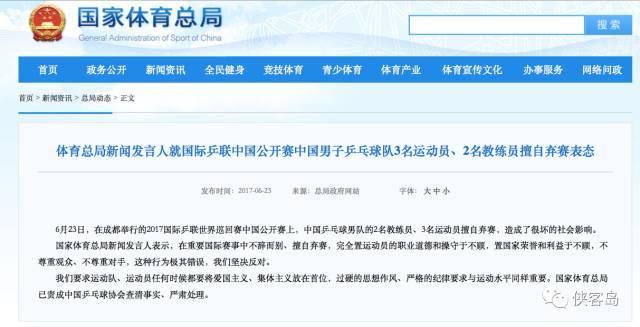 我们要求运动队、运动员任何时候都要将爱国主义、集体主义放在首位,过硬的思想作风、严格的纪律要求与运动水平同样重要。国家体育总局已责成中国乒乓球协会查清事实、严肃处理。”