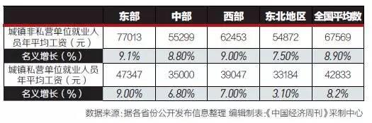 分省份看,截至6月28日,东北3省仅有吉林省公布了平均工资。数据显示,吉林省城镇非私营单位年平均工资为56098元。这个数据高于河南、山西、河北三省,排名第19位。该省城镇私营单位年平均工资为30184元,目前全国垫底。“东北平均工资增长缓慢是历史原因造成的。”张世贤告诉《中国经济周刊》记者,东北作为老工业基地,国有大企业众多,原来的工资基数要比中部高,但是这些年东北经济发展缓慢,工资上涨也缓慢。