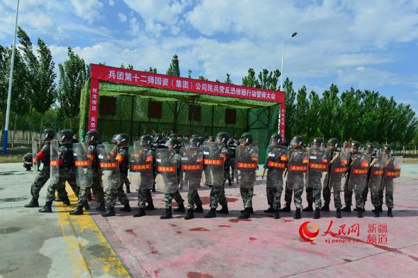 十二师国资(集团)公司基干民兵营特战连演示防暴队形。李晓啸 摄