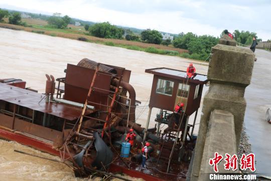 经过不断的努力,抽沙船于5日下午终于沉到江中,大桥也得以幸免。目前,后续工作还在进行中。