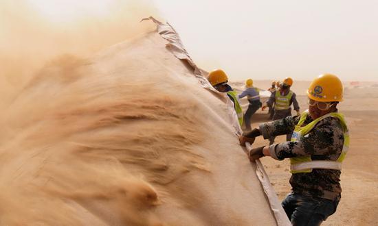 25岁的中铁项目部安全员桂武松,原本稚嫩的脸庞被风沙磨砺得粗糙了不少,他清楚地记得,他2015年3月19日第一次来到阿拉善盟施工地,就遭遇了一场遮天蔽日的沙尘暴。