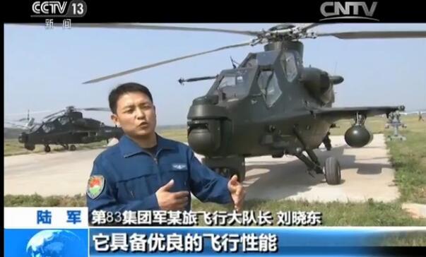 陆军第83集团军某旅飞行大队长 刘晓东: 这就是直-10直升机,它采用前后串联式的座舱,它具备优良的飞行性能和强大的空中火力突击能力,我们看这个位置,它是导弹挂架,它可以挂载空空导弹、空地导弹,这个位置现在挂的是副油箱,在作战的时候它可以挂载火箭弹筒,另外直-10还有一门航炮,直-10作为我们的主战机型已经具备了强大的空中火力突击能力。
