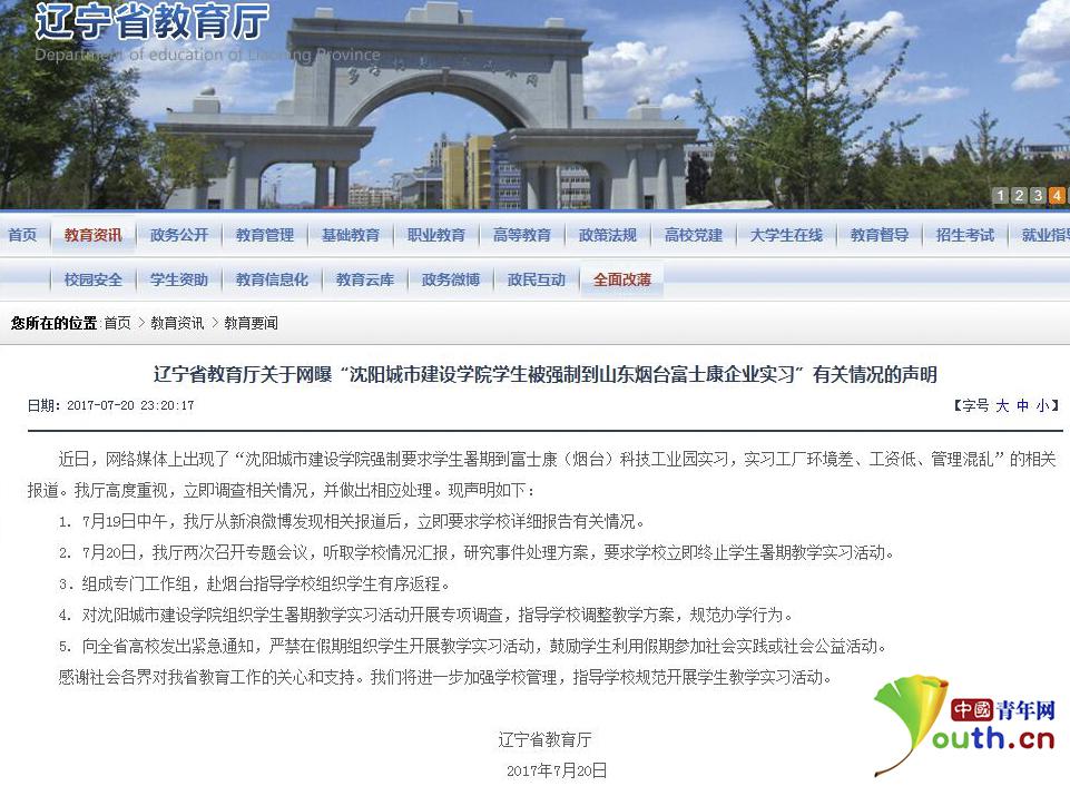 7月20日23时20分,辽宁省教育厅官方网站针对此事发布“辽宁省教育厅关于网曝‘沈阳城市建设学院学生被强制到山东烟台富士康企业实习’有关情况的声明”。