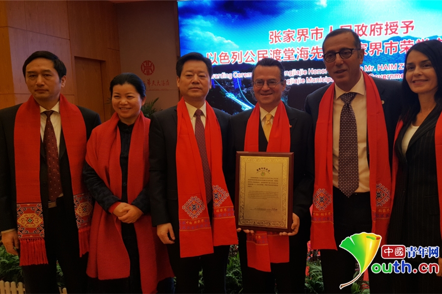 张家界市举行仪式授予大峡谷玻璃桥设计者渡堂海(右三)张家界市荣誉市民。以色列驻华大使何泽伟(右二)及夫人思佳丽,张家界市委书记虢正贵(左三)、张家界市人大党组书记、副主任余怀民(左二)、张家界副市长欧阳斌(左一)合影。中国青年网通讯员 王建军 摄