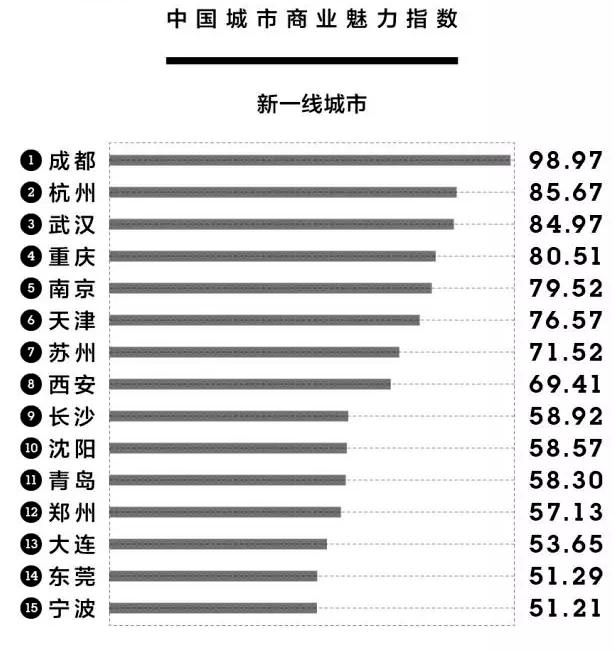 根据《第一财经周刊》今年5月底的报道,第一财经?新一线城市研究所依据大量最新的城市大数据,对中国338个地级以上城市再次排名,并发布了《2017中国城市商业魅力排行榜》。结果显示,北上广深4个一线城市的地位依然不可动摇,15个第一财经新一线城市的席位依次是成都、杭州、武汉、重庆、南京、天津、苏州、西安、长沙、沈阳、青岛、郑州、大连、东莞和宁波。
