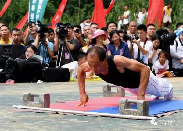 一名参加二指禅项目比赛的选手在比赛中