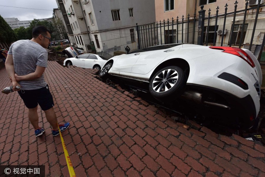 2017年8月4日,辽宁大连市沙河口区兰玉街,暴雨导致一小区挡土墙坍塌,部分车辆受损。