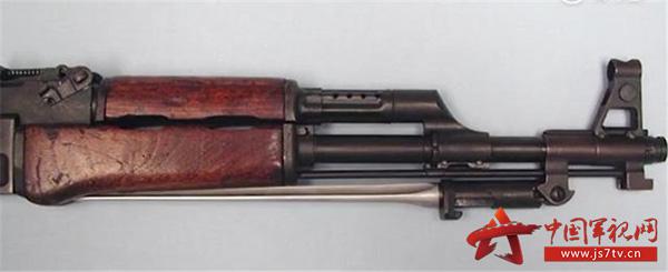 该枪装有标志性的折叠式三棱刺刀,与其原版AK47相比,56式冲锋枪最大的特征就是枪管下方的刺刀座和全包式的准心护圈,AK47为半包式,没有像56式这么明显的刺刀座。