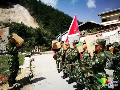 临时组成突击队后,官兵们紧急前往距九寨沟县九寨天堂东北方向1360米处的灾民聚集地。先遣队员中另有技术专家等人员,负责救援途中勘察地形,并协同运送所需物资,解救当地被困游客170名。官兵们发放完物资没有停歇,立即赶往下一个受灾现场。