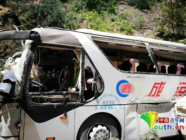 灾区受地震损坏的大巴车。通讯员 蔡必维 供图