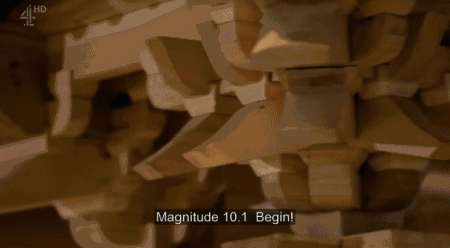 当实验强度达到9.5级时,建筑的摇晃已经非常剧烈了。据记载,这已经是历史中发生地震最高的地震强度,直白点类比,相当于200万吨TNT炸药的强度。最后当强度达到10.1级时,故宫的模型,依旧在巨大的摇摆中坚挺住了。