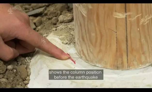 除了这巧妙的斗拱,他们还发现了另一个故宫的秘密。就是平时看起来平常无奇的柱子。故宫的柱子和其他一般建筑里深扎在地基里的柱子不一样。强大的震动,会很容易让那样的柱子折断。
