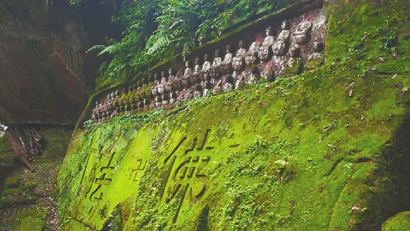 两个平台之间,是一面七八米高的山崖。崖面的中上部,雕刻着两排佛像,上面一排26尊、下面一排27尊,共计53尊。佛像大小相若,每个高约50厘米,神态不一,栩栩如生。让人痛心的是,上下两排各5个、共10个佛像的头已不翼而飞。这10尊佛像的脖子处,都留着新鲜的裂口。