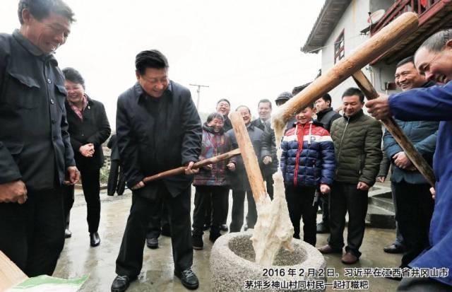 2016年2月2日,习近平在江西省井冈山市 茅坪乡神山村同村民一起打糍粑