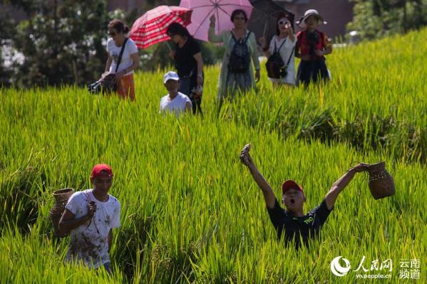 一名捉到稻田鱼的游客胜利欢呼 人民网 薛丹 摄