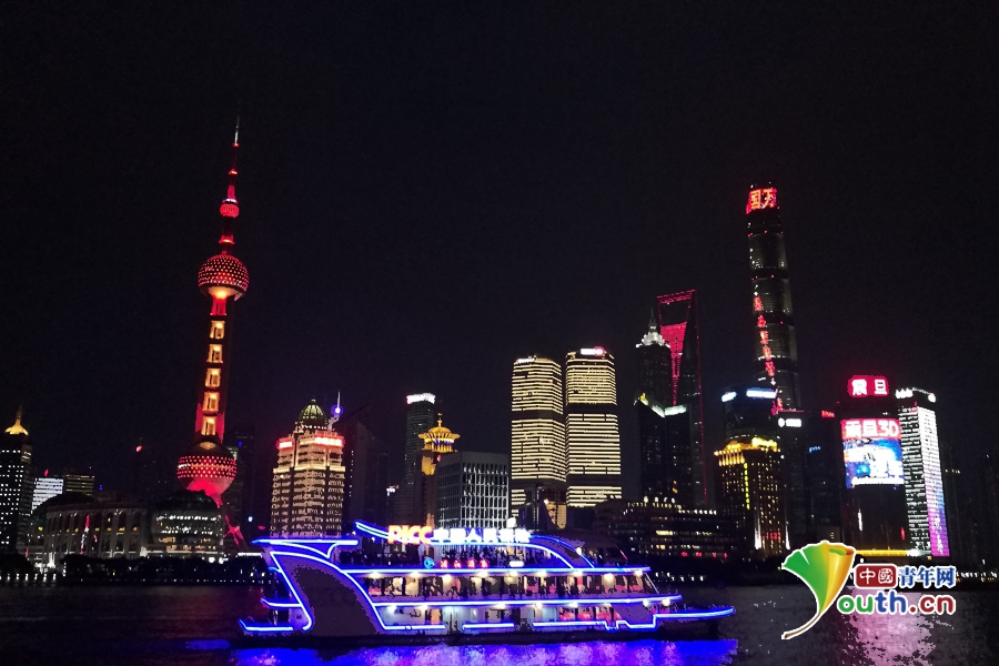 10月1日,高耸入云的上海中心上演灯光秀。图为上海中心的楼体上打出“庆祝国庆”“祖国万岁”的字样以及五星红旗的图案。