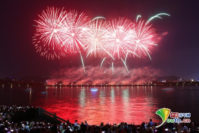 10月1日,长沙橘子洲举行了“国庆”、“中秋”烟花燃放活动,璀璨的焰火在空中绽放,吸引上万市民和游客驻足观赏。