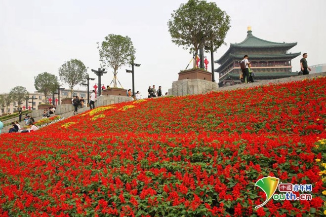 西安钟鼓楼广场鲜花国旗。 网友 供图