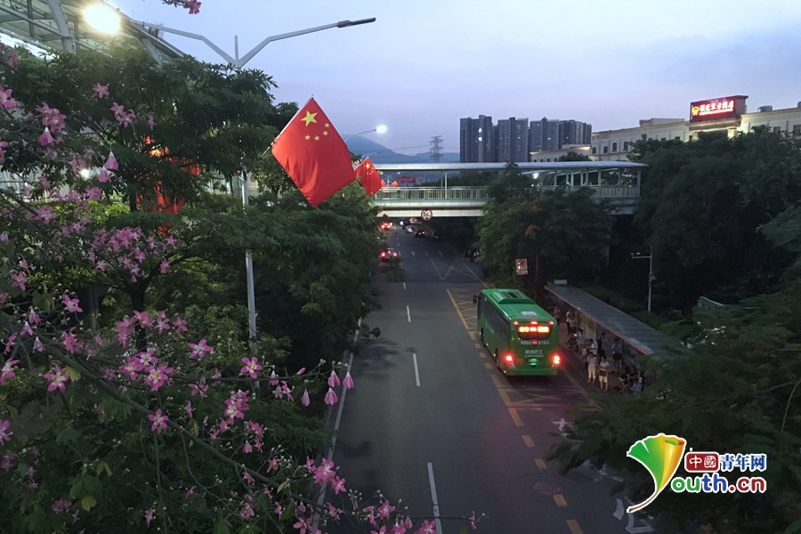 国庆期间,深圳市主要街道的路灯上都悬挂了国旗,增添了浓厚的节日气氛。