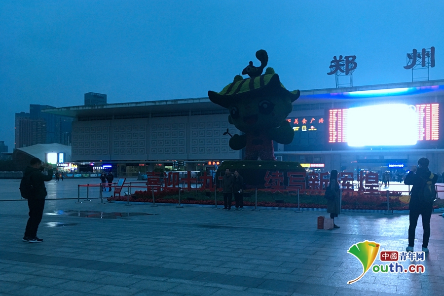 10月5日凌晨,在郑州火车站的“喜迎十九大,续写新辉煌”的花篮前,旅客们纷纷驻足合影。