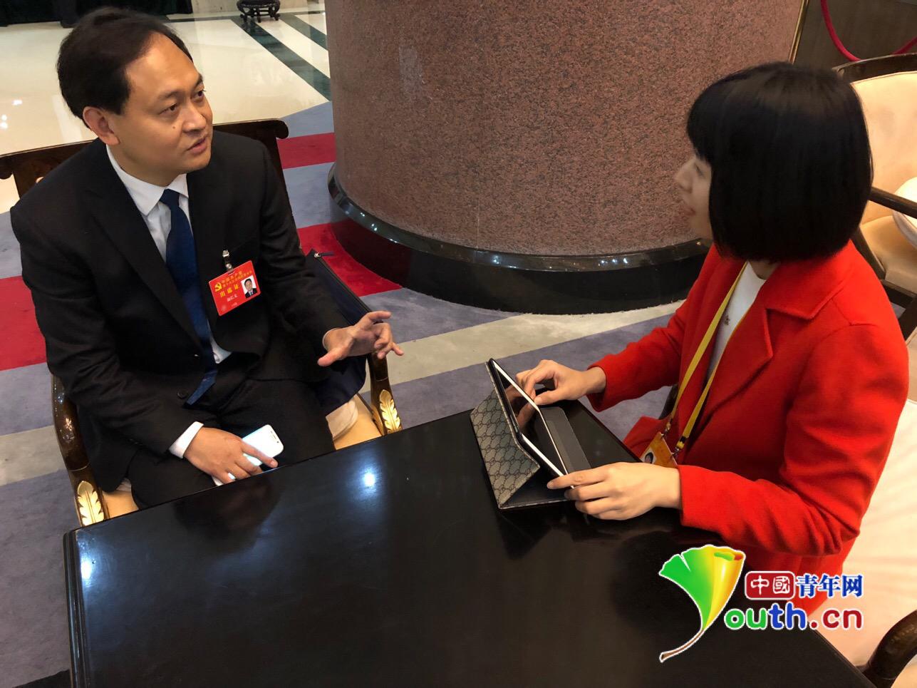 十九大代表、中共凤凰县委书记颜长文接受中国青年网记者专访。湖南省代表团工作人员摄