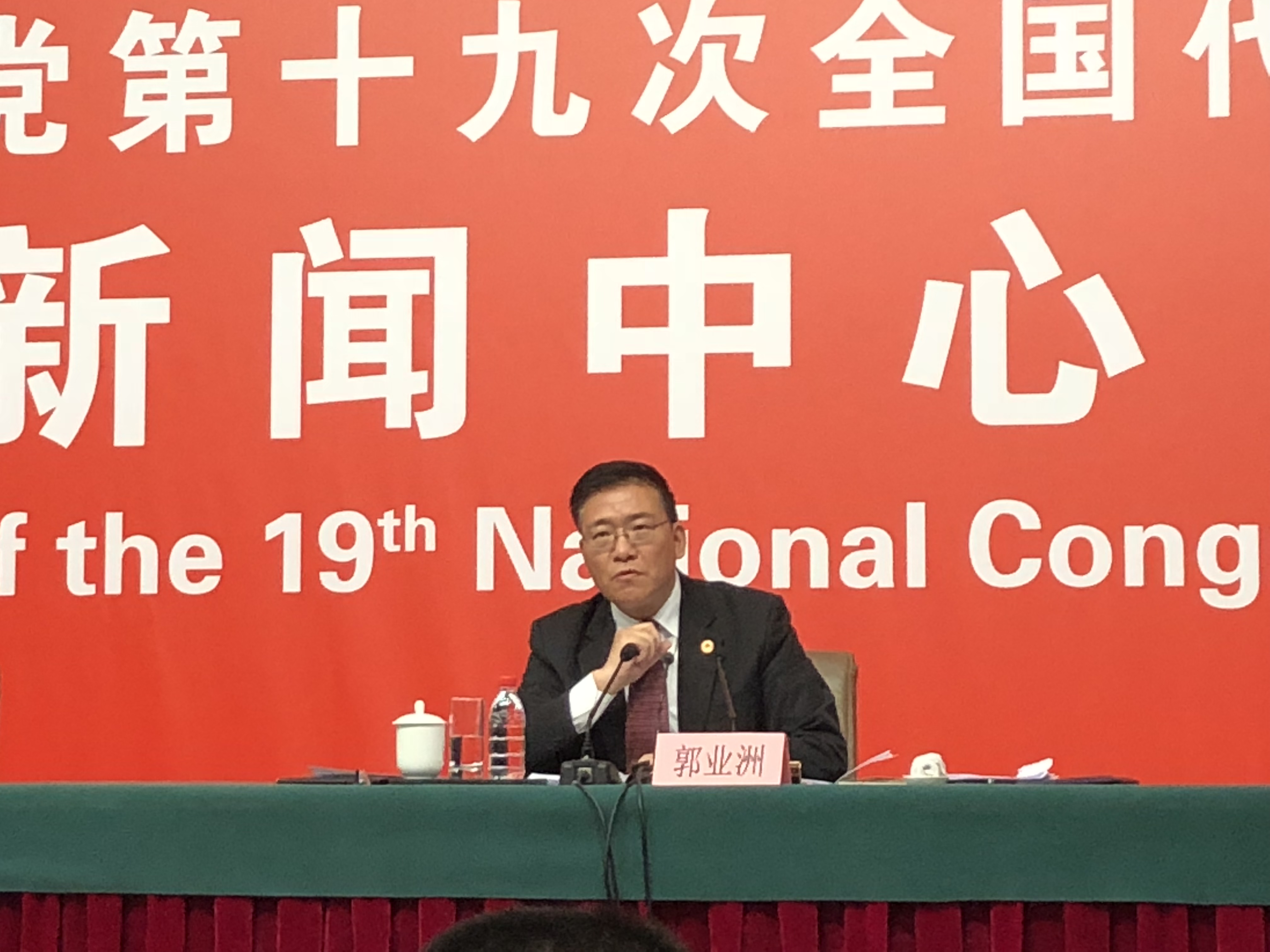 10月21日上午,十九大新闻中心将举办记者招待会。图为中共中央对外联络部副部长郭业洲回答记者问。中国青年网记者 吴楚 摄