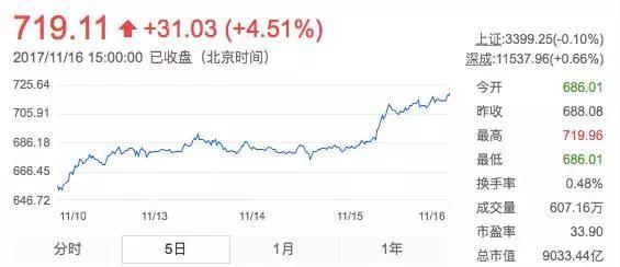 这些预测到底能不能实现,我们不妨拭目以待。不过,在A股市场,能有贵州茅台股价这样涨势的股票,的确不常见。根据数据,今天贵州茅台收盘价719元,市值已经突破9000亿元人民币。