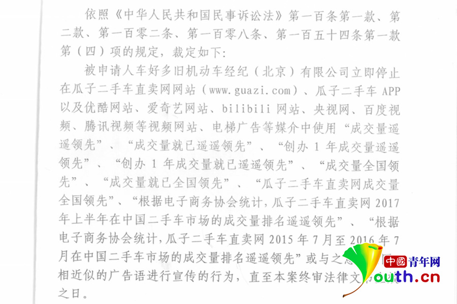 法院最终裁定,瓜子网实施了引人误解的虚假宣传行为,为避免正在实施的虚假宣传行为对作为同行业主要竞争者的合法权益造成进一步损害,有必要暂时禁止瓜子网实施的上述虚假行为,直至本案终审法律文书生效。