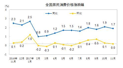 国家统计局数据显示,2017年11月份CPI同比上涨1.7%。1-11月平均CPI比去年同期上涨1.5%。