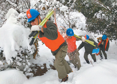 1月初,湖北枣阳暴雪天气造成6.1万户居民断电,抢险人员赴各地抢修供电设施。