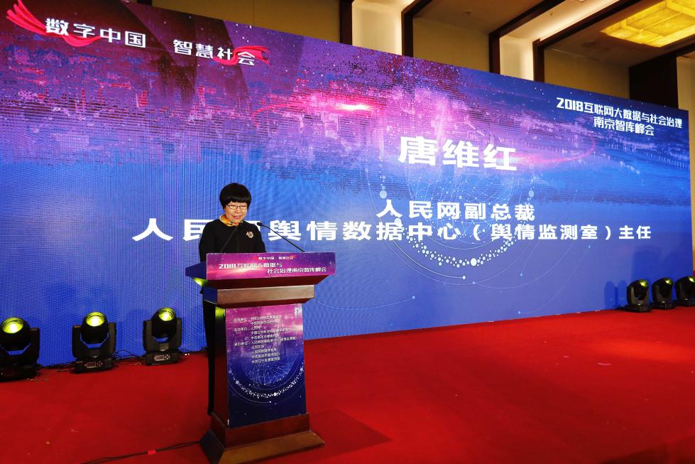 人民网南京1月27日电(张力 洪治) 今日上午,2018互联网大数据与社会治理南京智库峰会在南京市举行。峰会由人民网、中国社会科学院新媒体研究中心与中共南京市委宣传部主办,人民网舆情数据中心(舆情监测室)、人民在线、人民网新媒体智库、中共南京市委网信办与中共江宁区委宣传部共同承办。中国网络空间研究院副院长侯云灏,人民网副总裁、人民网舆情数据中心主任唐维红,中国社会科学院新媒体研究中心主任、新闻与传播研究所所长唐绪军,南京市委常委、宣传部长曹路宝出席并发言。