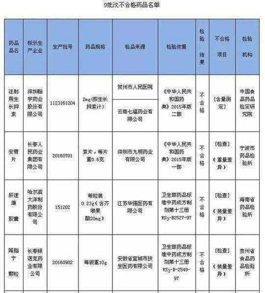 一、不合格产品的标示生产企业、药品品名和生产批号为:深圳翰宇药业股份有限公司生产的批号为1123161204的注射用生长抑素,长春人民药业集团有限公司生产的批号为20160701的安胃片,哈尔滨大洋制药股份有限公司生产的批号为151202的肝速康胶囊,长春银诺克药业有限公司生产的批号为20160902的降脂宁颗粒,北京同仁堂科技发展股份有限公司制药厂生产的批号为15080858的开胸顺气丸,重庆灵方三帆生物制药有限公司生产的批号为150903的麝香壮骨膏,太康海恩药业有限公司生产的批号为161101的胃蛋白酶颗粒,多多药业有限公司生产的批号为1609231的维生素E烟酸酯胶囊,齐鲁制药有限公司生产的批号为5120108AE的注射用头孢拉定。不合格项目包括性状、含量测定、崩解时限、重量差异、装量差异、含膏量、效价测定。