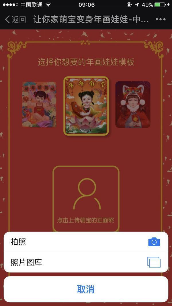 这就是我们推出的新年神器——让“萌宝”变身年画娃娃,上传宝宝or自己or脑公的照片,就可以生成属于自己的年画照了。