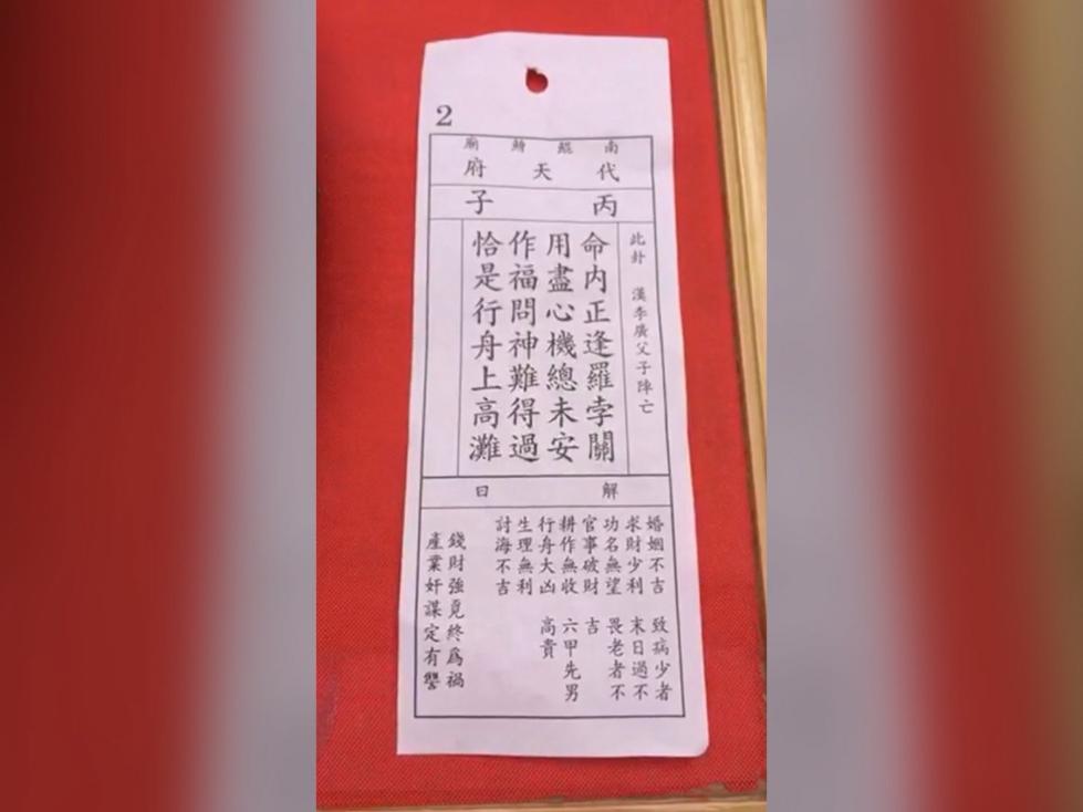 据台湾“东森新闻云”2月16日报道,今年“南鲲鯓代天府”抽到的签是结果抽到第4支“丙子”签。“丙子”签“汉李广父子阵亡”是“南鲲鯓代天府”第2首签诗,签诗内容为“命内正逢罗孛关,用尽心机总未安,作福问神难得过,洽是行舟上高滩”。