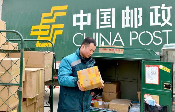 2月15日,河南商丘,中国邮政河南省夏邑县分公司县城主城区投递员姚磊鑫在往投递车上装邮件。视觉中国 图